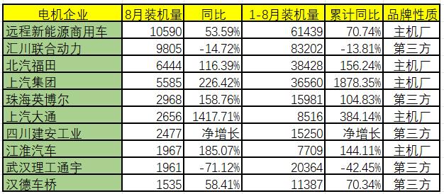 一方面,8月新能源物流车主机厂自主品牌电机均保持高速增长,除了基数已经很高的远程新能源商用车,其他主机厂自主品牌电机平均同比增幅均维持倍增态势。而第三方电机品牌同比表现喜忧参半,除了汇川联合动力痛失冠军宝座,武汉理工通宇跌幅最大(-71.12%),主要原因是痛失核心客户上汽通用五菱。四川建安工业、珠海英搏尔和汉德车桥保持增长,主要得益于各自核心客户的青睐。其中,四川建安工业供应长安凯程和长安跨越;珠海英搏尔的最大客户上汽大通仍贡献了2000台装机量;汉德车桥则受益于新能源轻卡对车桥产品的需求增长。